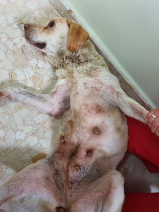 Auri muss vor kurzem Welpen geboren haben, ihr Gesäuge war prall gefüllt mit Milch und stark entzündet. Der Test auf Mittelmeererkrankungen ergab, dass sie an Leishmaniose erkrankt ist und ihre Nieren kaum noch arbeiteten. Die Blutwerte bei Einlieferung in die Klinik waren katastrophal.