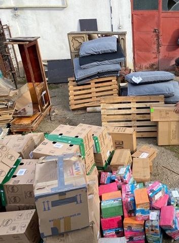 Iuliana hatte für diesen Tag Hilfe organisiert, Freunde und Bekannte krempelten die Ärmel hoch und das Abladen begann. Alle Spenden wurden zuerst im Hof zwischengelagert, um sie anschließend in der zum Shelter gehörenden Halle gut sortiert zu verstauen.