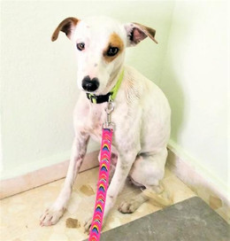 Die knapp einjährige zierliche Hündin in weiß mit rotbraunen Abzeichen an den Ohren und als Fleck am linken Auge ist mit ca. 45 cm Schulterhöhe und geschätzt 12 Kilos mittelgroß, darf aber gerne noch etwas an Gewicht zulegen.