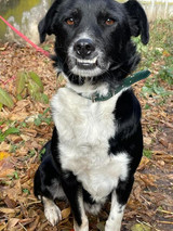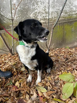 Franz ist ein hübsches Kerlchen und trägt den typischen Border-Collie-Look: er ist schwarz mit großer weißer Blesse, weißer Brust mit Kragen, vier weißen Söckchen und einer weißen Schwanzspitze. Franz ist bereits ausgewachsen und nur mittelgroß, mit einer Schulterhöhe von 43 cm und geschätzten 12 kg.
