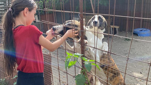 Mitte März 2023 wurde eine Straßenhündin mit ihren zwei Welpenmädchen von Iuliana gesichert. Die ca. 2 Monate alten Welpen waren Frieda und Tinka (auch bei uns in der Vermittlung). Obwohl die Mutter sehr scheu war, haben sich die zwei Schwestern dieses Verhalten nicht abgeschaut, sondern auf Menschenbesuch immer neugierig reagiert. Inzwischen sind sie völlig aus dem Häuschen, wenn Iuliana zum Füttern auftaucht. Sie legen sich ihr zu Füßen, springen gut gelaunt um sie herum und genießen die freundliche Ansprache und die Streicheleinheiten.