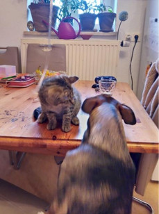 Die Kleine wurde auch vom Kater der Familie sehr gut aufgenommen, sie spielen gern miteinander und fressen sogar aus einem Napf 😘. Allerdings nur der Kater das Hundefutter, denn Katzenfutter ist für Hunde tabu.