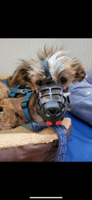 Momentan ist der Juckreiz durch die Leishmaniose wieder so stark, dass der kleine Mann einen Maulkorb tragen muss, ansonsten würde er sich blutig kratzen.