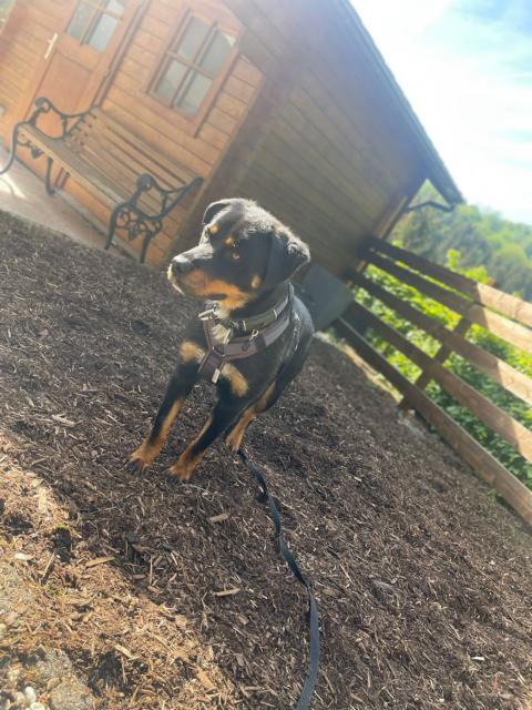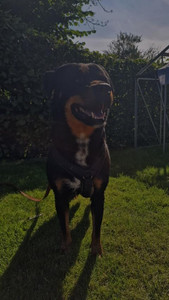 Tessa ist eine extrem menschenbezogene Hündin und in jeder Hinsicht ein typischer Rotti: ein Kraftpaket mit einer Seele und Fell aus Samt! Sie trägt das klassische Fell in black-and-tan mit den symmetrischen rot-braunen Abzeichen und dazu einen weißen „Schlips“, der sie unverwechselbar macht. Sie hat eine Schulterhöhe von ca. 60 cm und wiegt ca. 35 Kilo.