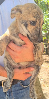 Tiger bekam seinen Namen nicht von ungefähr: der bildhübsche Mischling ist von der Schnauze bis zur Schwanzspitze hell in sand/anthrazit-gestromt. Die großen Kippohren sind noch nicht entschieden, ob sie einmal stehen wollen. Alle Wurfgeschwister werden ausgewachsen voraussichtlich mittelgroß mit um die 15 kg Gewicht werden.