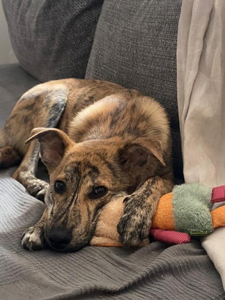 Tiger ist seit November bei uns. In der Zeit hat er sich super entwickelt, anfangs kam er kaum aus seiner Kiste und hatte ziemlich große Angst vor fremden Hunden, Menschen und Autos. Mittlerweile haben wir das aber gut im Griff. Auto fahren liebt er und im Wald und der Natur blüht er auf. Fremden Hunde ist er anfangs sehr misstrauisch gegenüber, wenn das Eis dann aber bricht, ist er total verschmust und verspielt. So hat er auch schon ein paar gute Freunde finden können.Wie auch seine Geschwister, kann Tiger ein ziemlicher Dickkopf sein. Aber mit etwas Zeit und Geduld klappt’s dann doch ganz gut mit dem Training. Zuhause ist er total ruhig und entspannt, würde am liebsten den ganzen Tag auf dem Sofa liegen und schmusen. Beim Spielen ist er ein totaler Clown, hüpft durch die Gegend und ist manchmal schon recht ulkig 😅