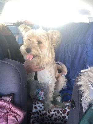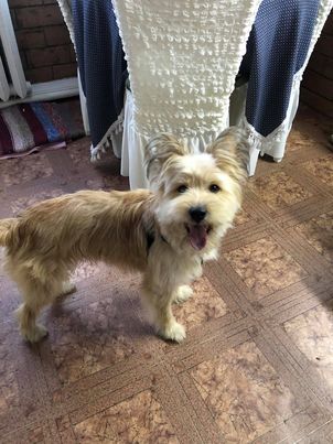 Willy ist ein Terrier-Mix mit einem süßen Ringelschwänzchen. Sein langes Fell ist hellbeige und flauschig.