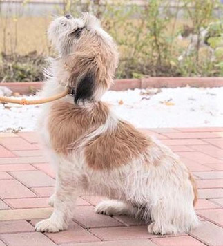 Zoe ist eine kleine Zottelmaus: sie hat eine Schulterhöhe von 27 cm und wiegt nur 6 Kilo. Ihr mittellanges Fell ist etwas rauhaarig in weiß mit zimtfarbenen Ohren und Rückenabzeichen.